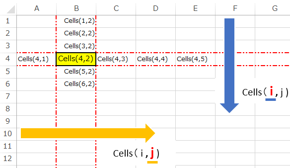 CellsプロパティはCells(行,列)でワークシートの位置を指定します。