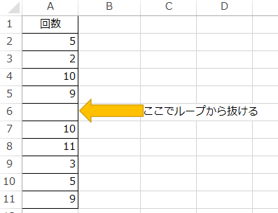 セルが空白の時ループを抜けて何行目の実行でループを抜けたかメッセージボックスに表示させる例文です。